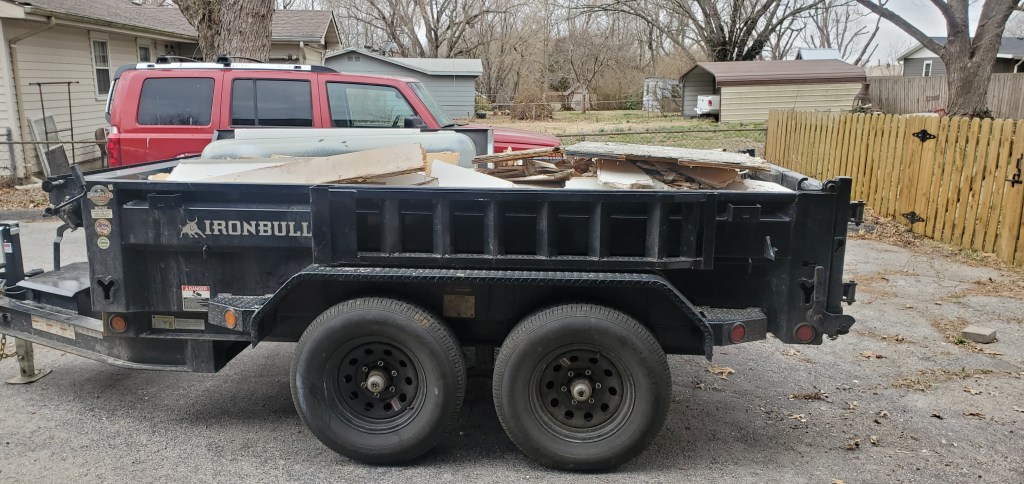 When Mike got here with his super cool, super nice hydraulic dump trailer, we started in on the paneling. We were pretty surprised that we filled it with just that. So he hauled it off to burn so that we could start in on the stuff that would have to go to the dump. The next day we filled that up and off he was to the dump and back. Which we filled up again. Two bathrooms and we are up to three loads. By the time we get finished I’m sure there will be another.