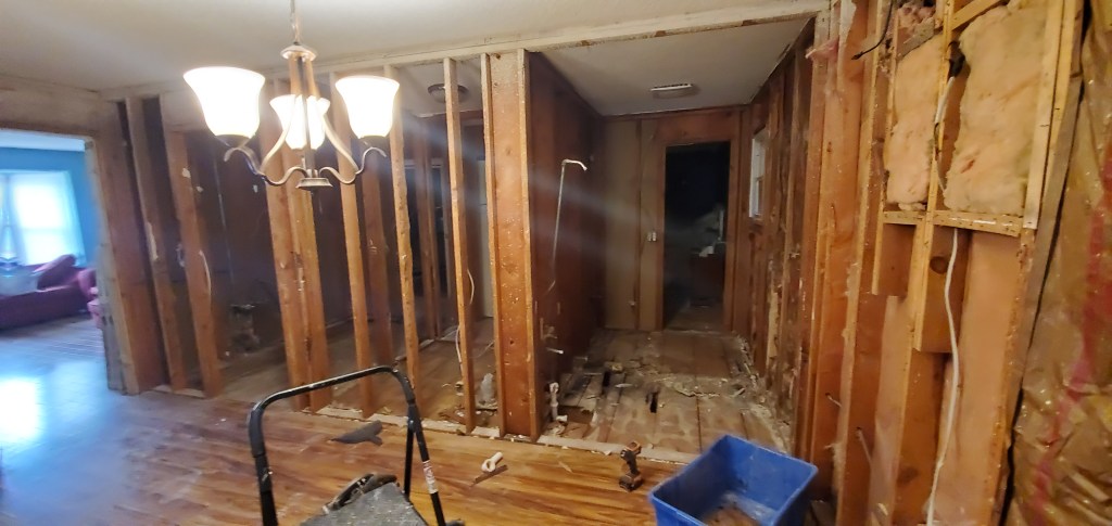 One thing I have learned since my first remodel back in 2006 is that you might as well take everything down to studs and build it like you want. I have tried a few times to build on top of the old or try to get away with matching the old to the new and it just doesn’t work. In this case, we took out old subflooring as well because they had tiled it and there was no way to clean it off without spending massive man hours on it. We are also moving doorways and that means that the paneling, which Katie has valiantly spruced up over the last 5 years, was finally going to have to go. Now I can see all the fun stuff: the shoddy framing they tried to do around an old AC unit, the rotted wood on what used to be an exterior wall, and the spliced electrical wires dangling in the cavities.